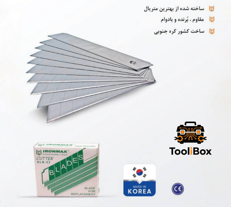 تیغهای موکتبر آیرونمکس (IRONMAX) محصولی اورجینال و باکیفیت ساخت کره جنوبی هستند که برای برشهای مداوم و سنگین طراحی شدهاند. استفاده از فولاد کربن بالا (SK5 High Carbon Steel) در ساخت این تیغهها باعث شده تا لبهی برش بسیار سخت و مقاوم باشد و در استفاده طولانیمدت، کُند نشود.