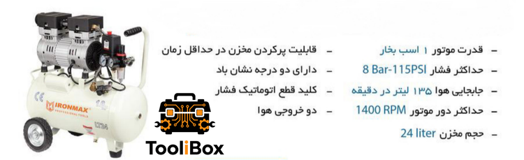 | نام انگلیسی | IRONMAX Silent Air Compressor 24L Twin Cylinder |