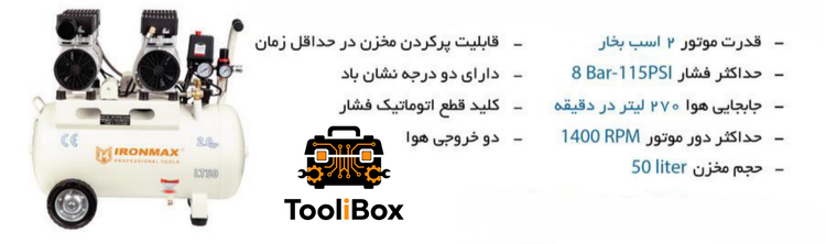 | نام انگلیسی | IRONMAX Silent Air Compressor 50L 4-Cylinder Dual-Motor |